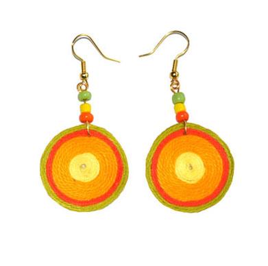 Легкі кульчики зроблені із натуральних ниток, а зі споду покриті прозорим закріплювачем. Захищені від дощику, але ванну приймати у прикрасах не варто, як і купатися :)